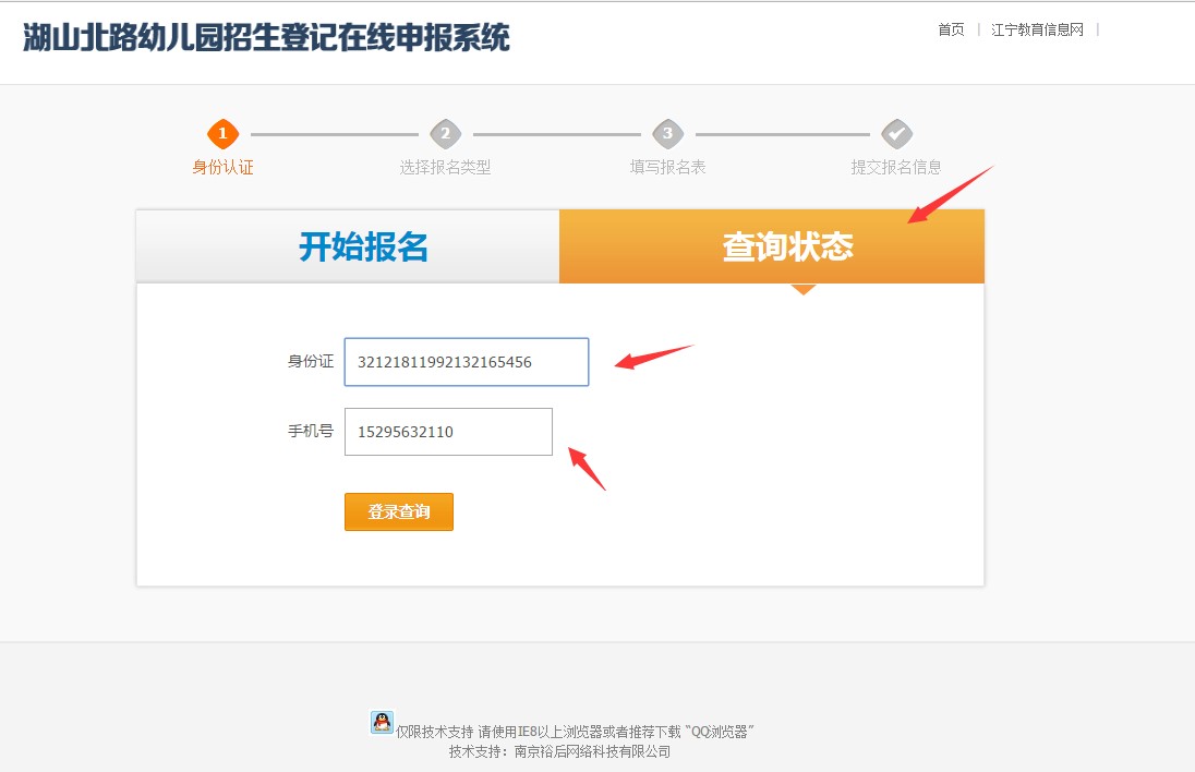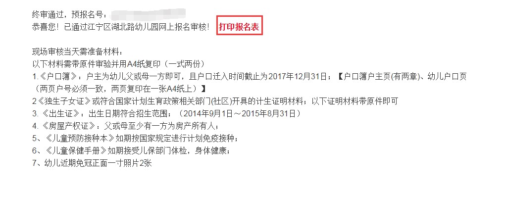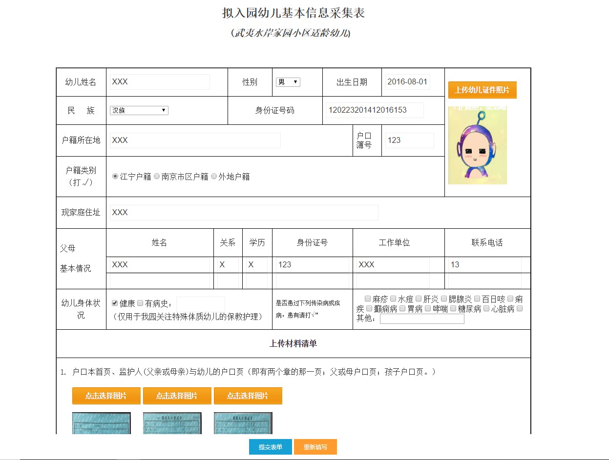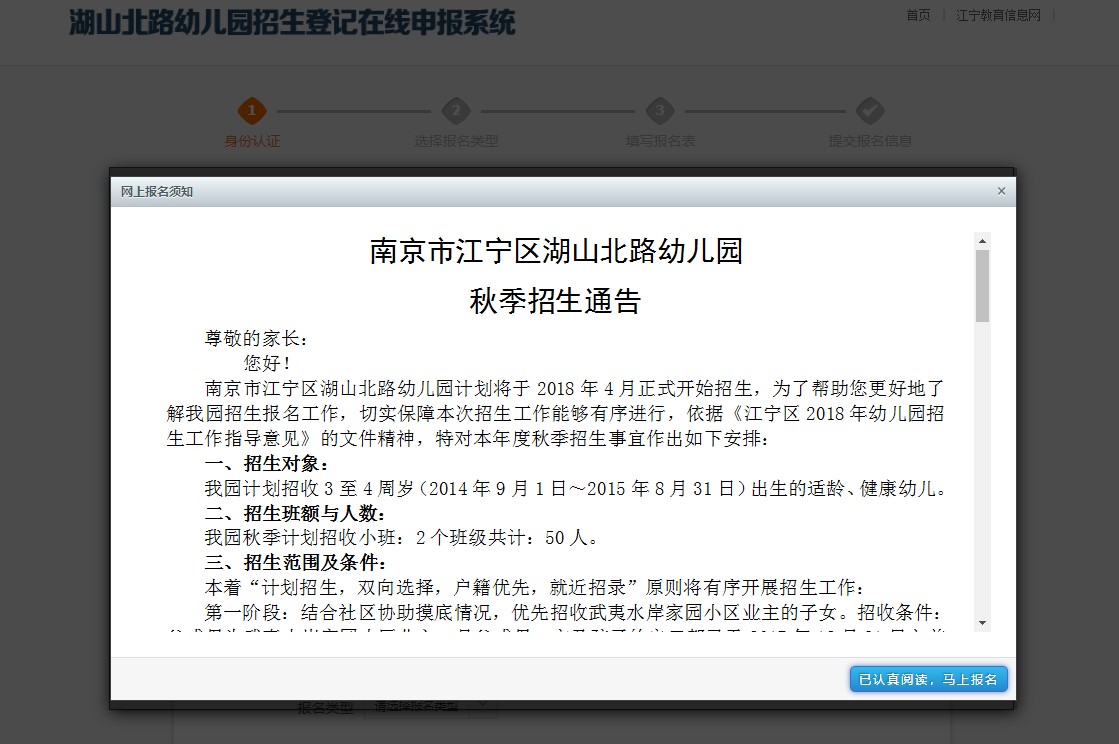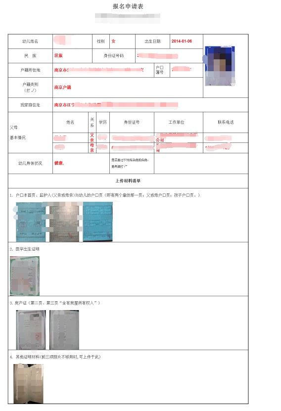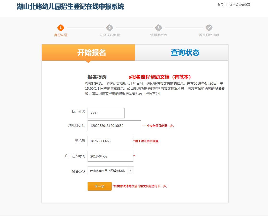 一、输入网址进入主界面: 二、进入报名页面请仔细阅读报名须知,阅读完点击同意按钮,进入下一步 三、进入填写学生信息界面,注意填写身份证信息,只招收三周岁至四周岁的学生(2014年9月1日~2015年8月31日出生的),填写完毕进入点击下一步。 四、进入界面,填写幼儿园入园儿童基本信息采集表,请认真填写信息,需要上传图片的内容请保证图片清晰,确定无误后,点击提交表单。 需上传图片样式如下: 出生医学证明 户籍簿 房产证 五、报名成功后出现提示界面。 六、报名成功如需查询报名状态,进入考试报名窗口右边的查询状态根据学生身份证号、手机号进行查询。 七、确认任何通过后下载《报名申请表》。